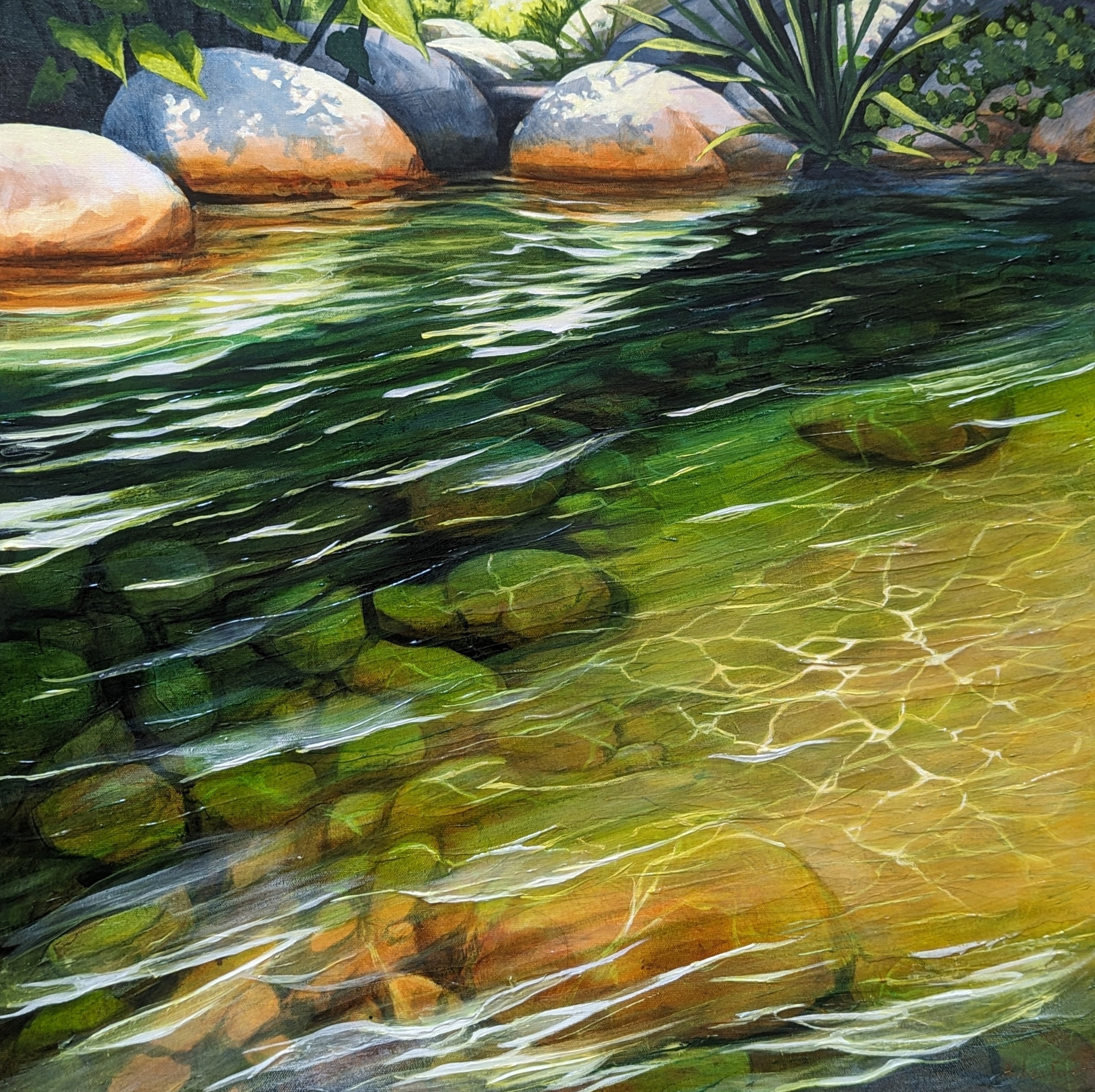 The story behind this series of paintings was to capture the feeling of relaxing at the cool waters edge in summer. inspired by many places in Canada (the Elora Gorge, lakes around Vancouver, squamish, Whistler and Vancouver Island, as well as the Muskoka region). This painting is about giving you space to relax at home in your busy life. a place to slow down and daydream.