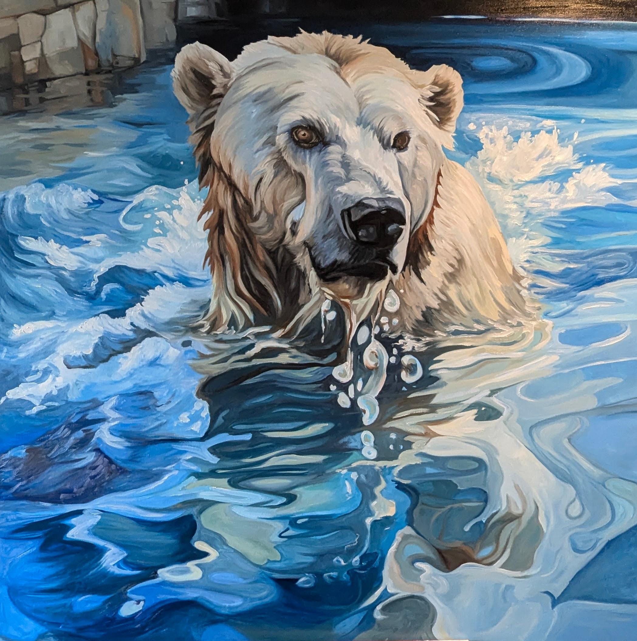 This painting is a large scale oil painting of a Polar Bear swimming on a bright sunny day.