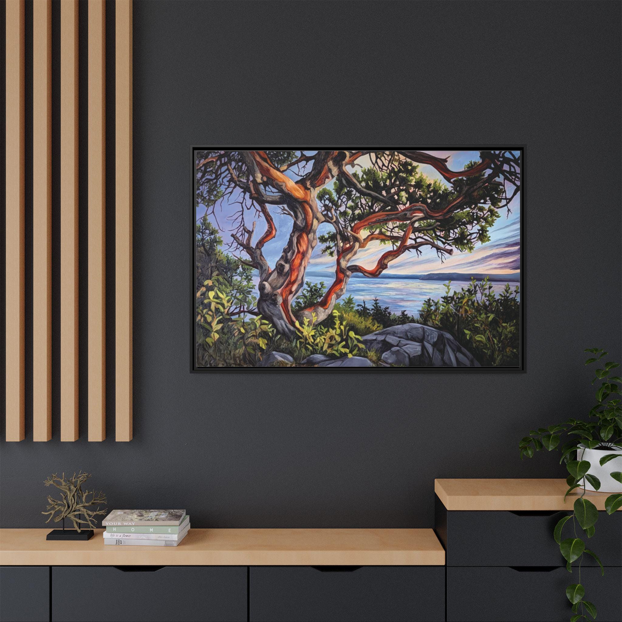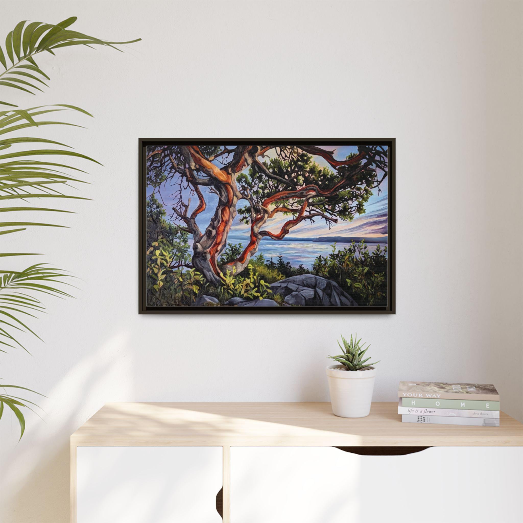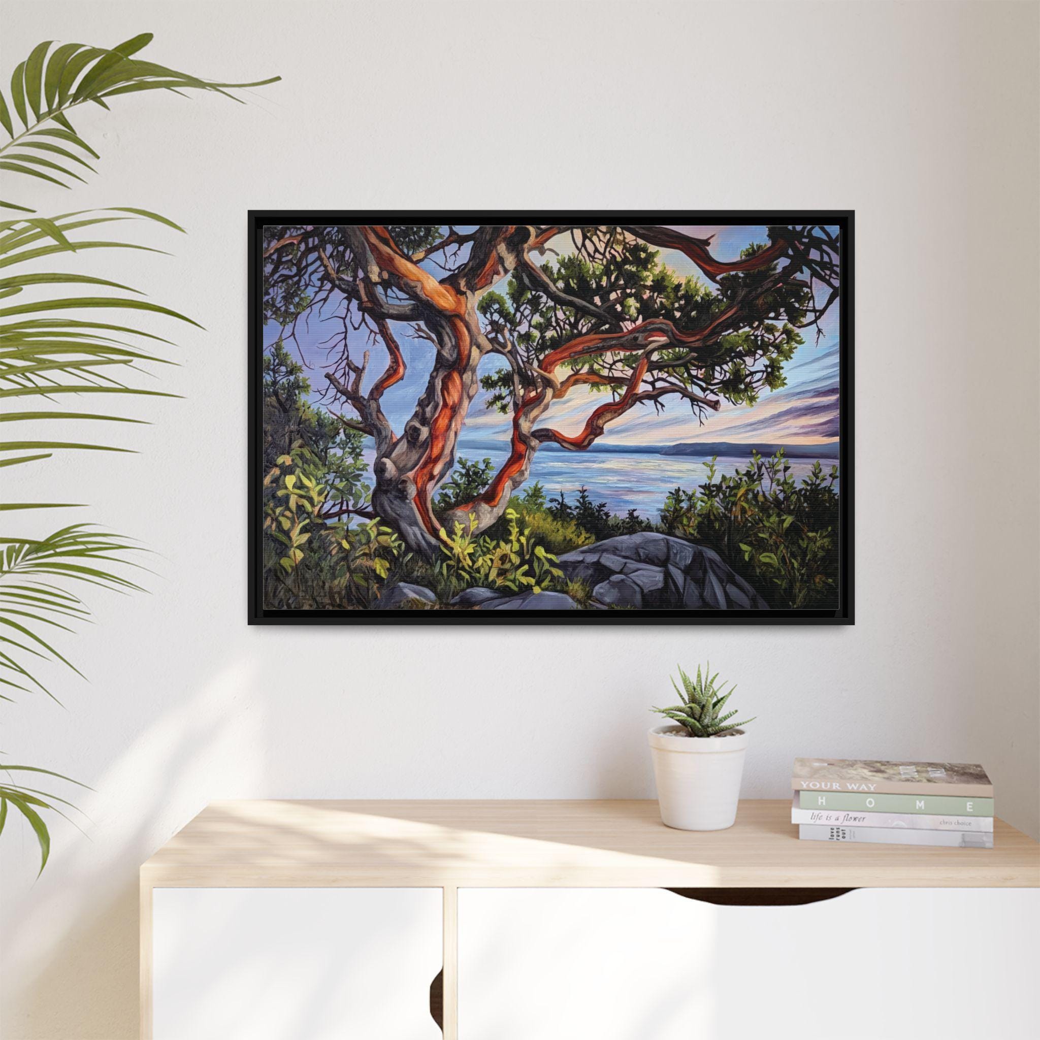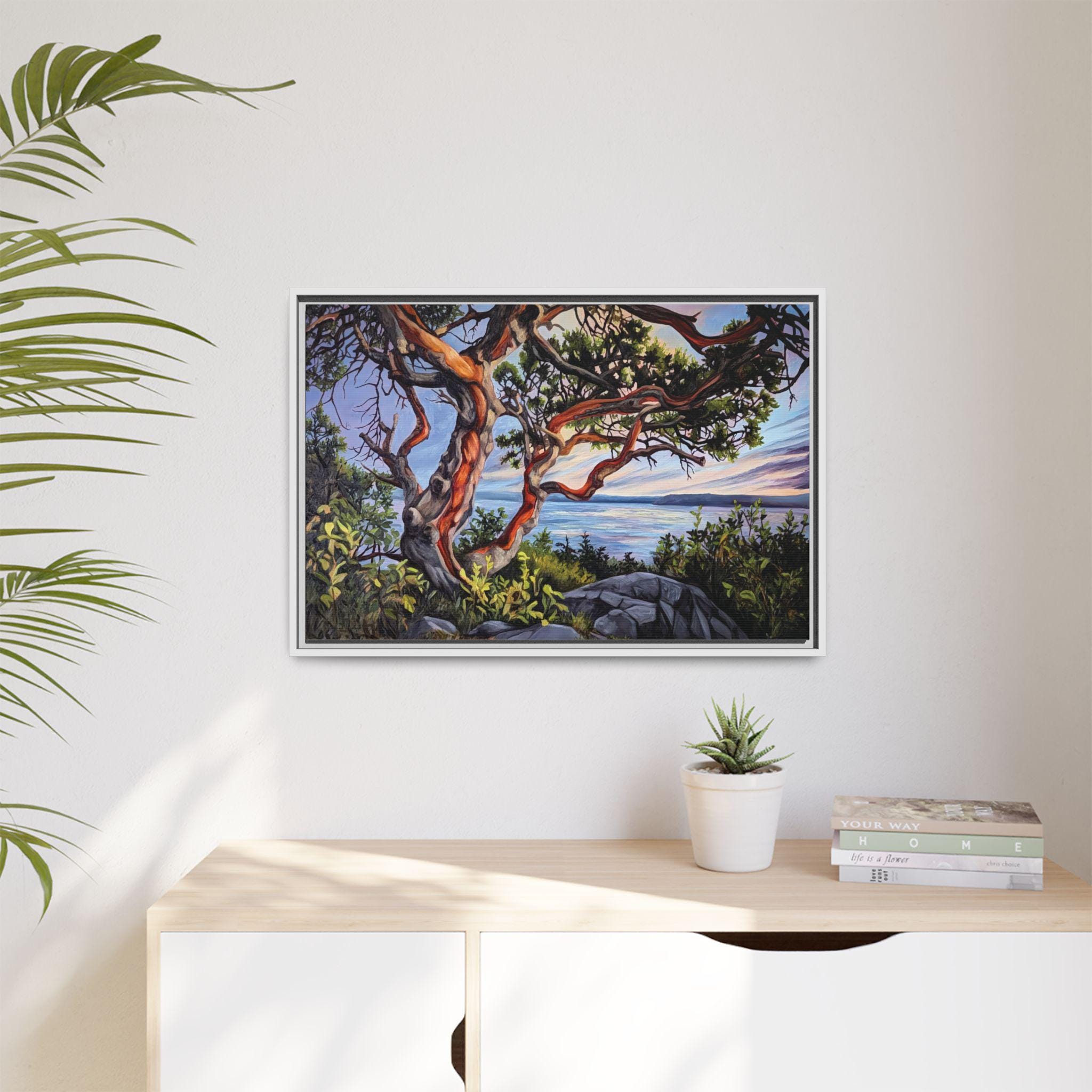 Warm, salty air and the hush of a Pacific sunset — this framed matte canvas brings Andrea Fryett’s oil painting of an arbutus tree and the BC coastline into your living space. The textured matte surface keeps glare low and emphasizes brushstrokes, while the multi-color framing option lets the piece sit naturally among coastal woods and soft neutrals. Hang it over a reading nook, above a mantel, or in an entryway where it can be a quiet reminder of shoreline walks and golden-hour light. The scene invites slow breaths and lingering moments, fitting seamlessly into a home that values handmade art, travel memories, and the patient rhythm of the coast.