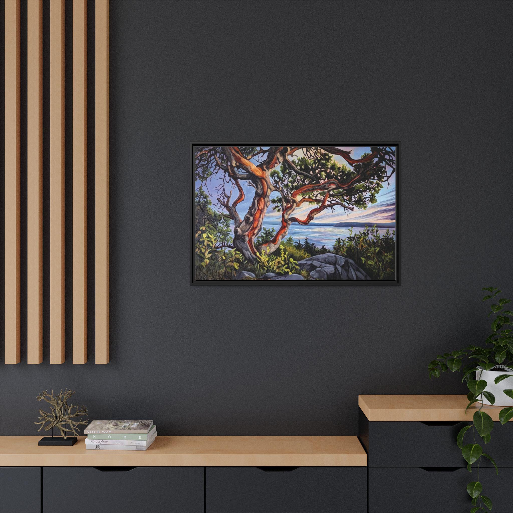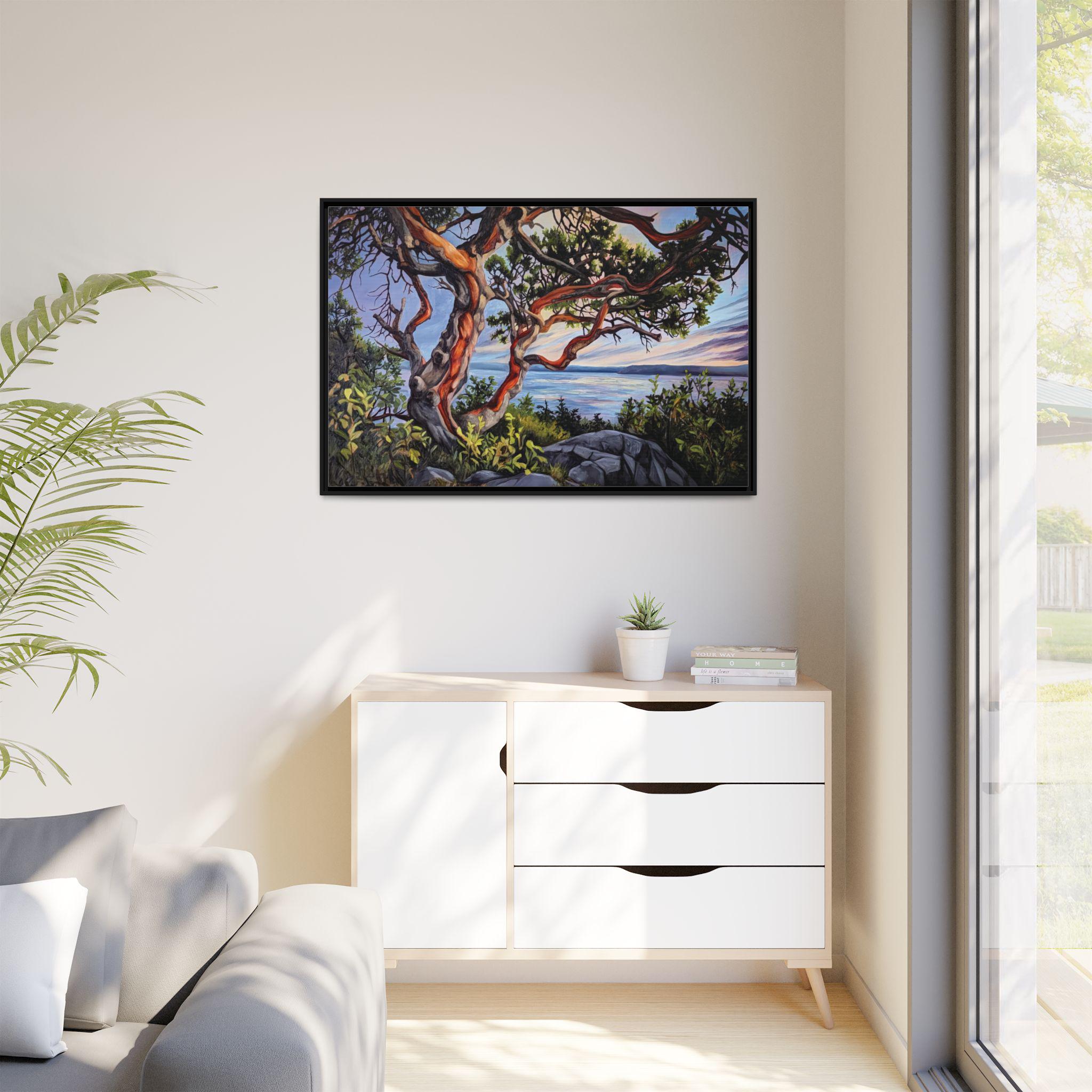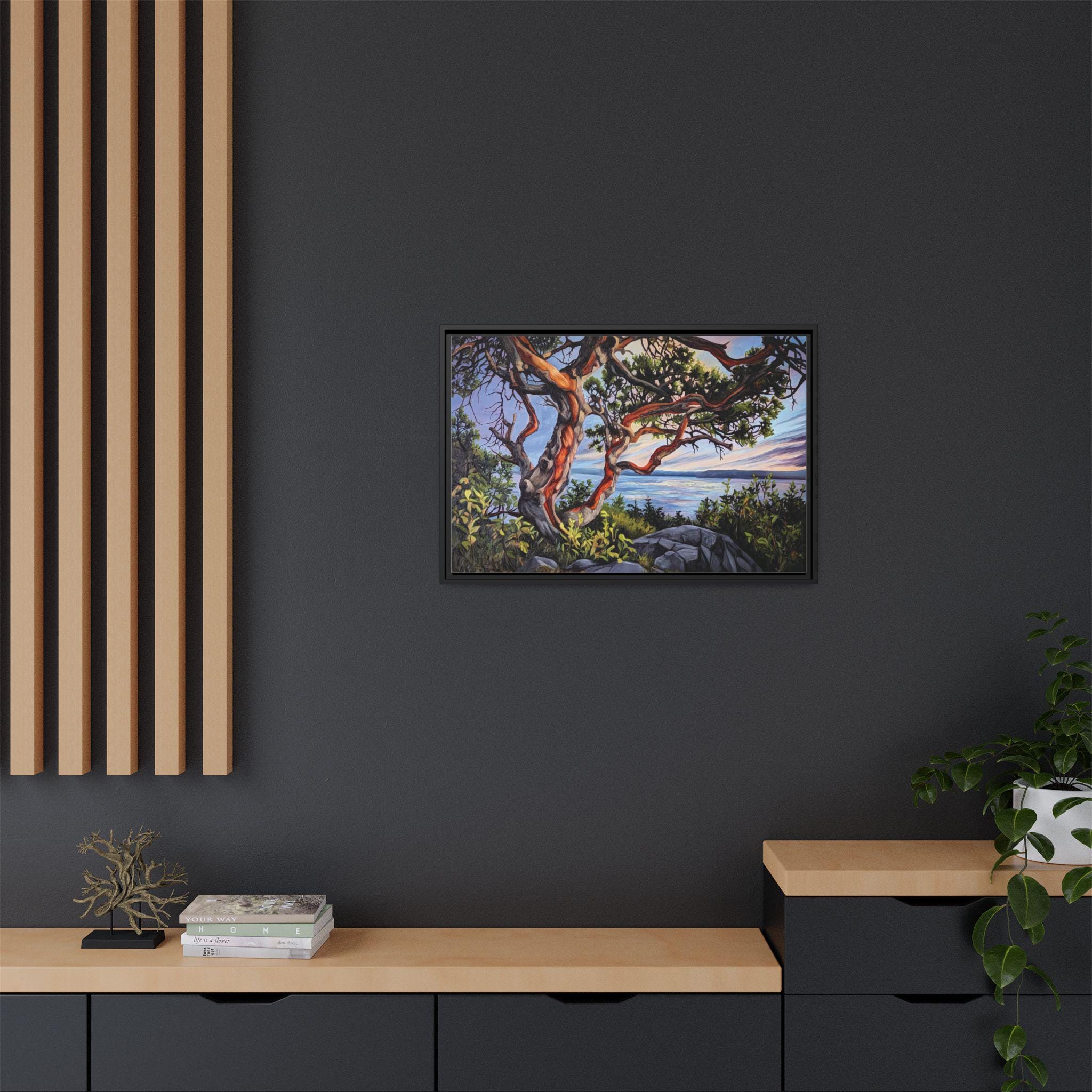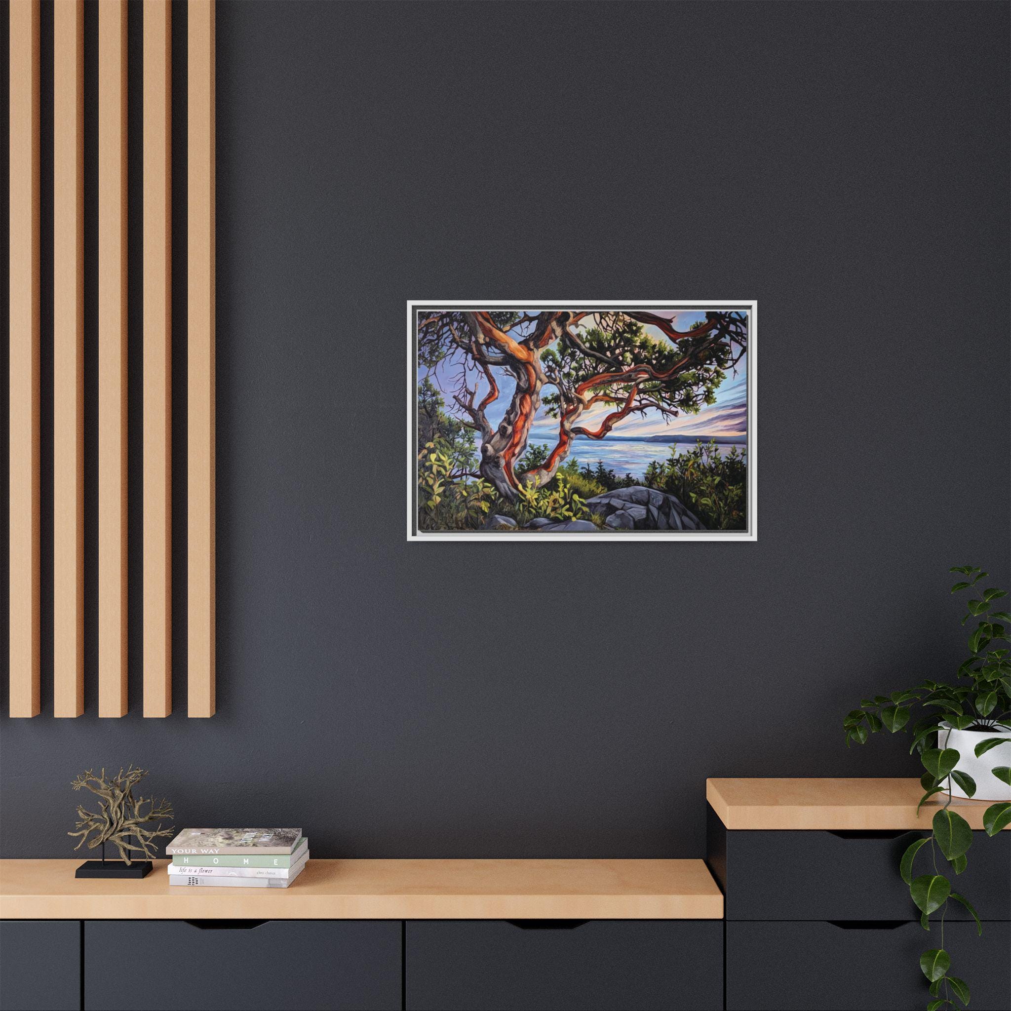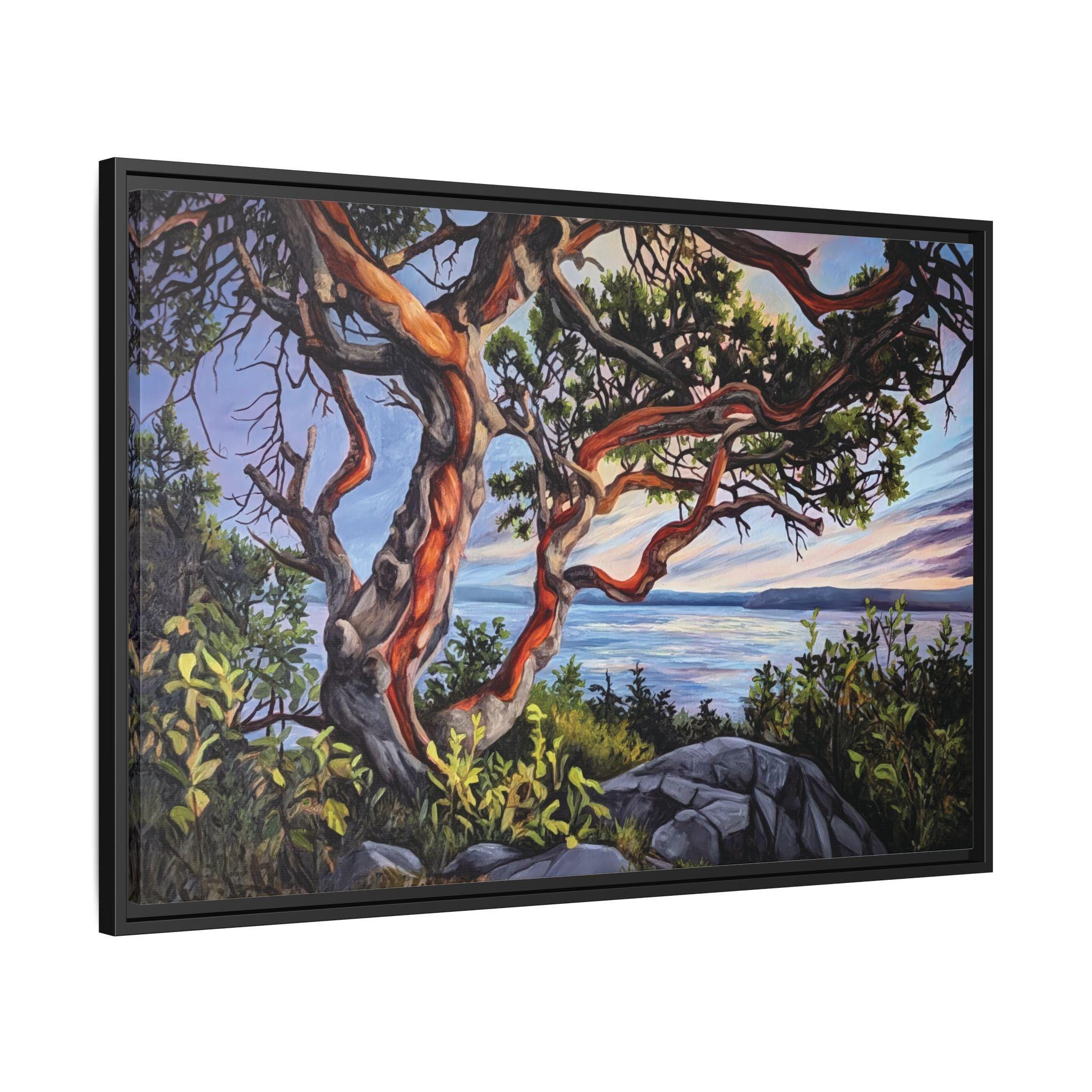 Warm, salty air and the hush of a Pacific sunset — this framed matte canvas brings Andrea Fryett’s oil painting of an arbutus tree and the BC coastline into your living space. The textured matte surface keeps glare low and emphasizes brushstrokes, while the multi-color framing option lets the piece sit naturally among coastal woods and soft neutrals. Hang it over a reading nook, above a mantel, or in an entryway where it can be a quiet reminder of shoreline walks and golden-hour light. The scene invites slow breaths and lingering moments, fitting seamlessly into a home that values handmade art, travel memories, and the patient rhythm of the coast.