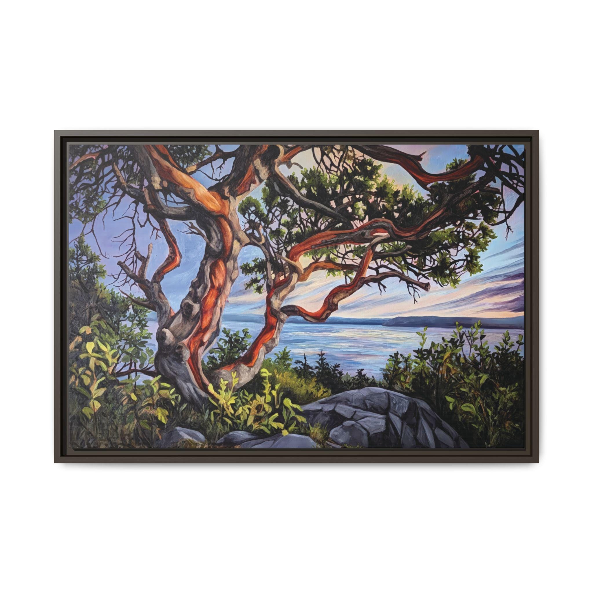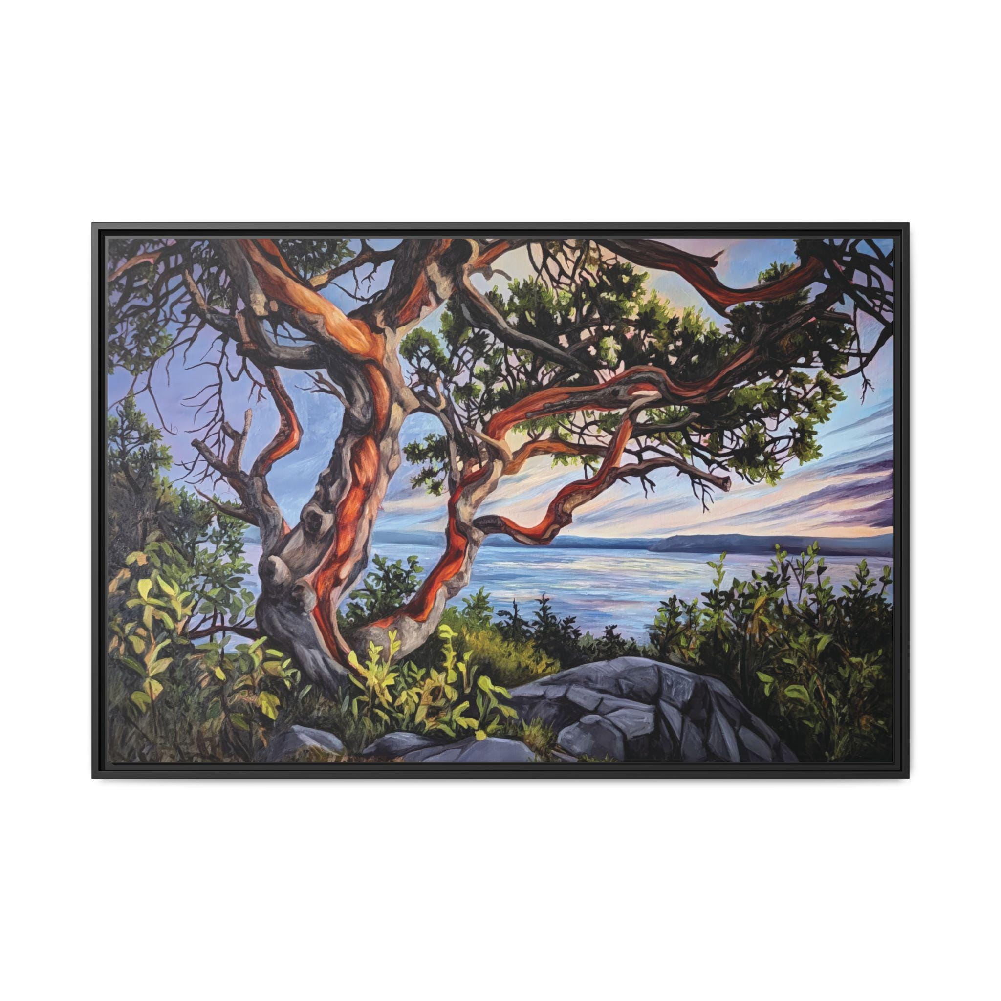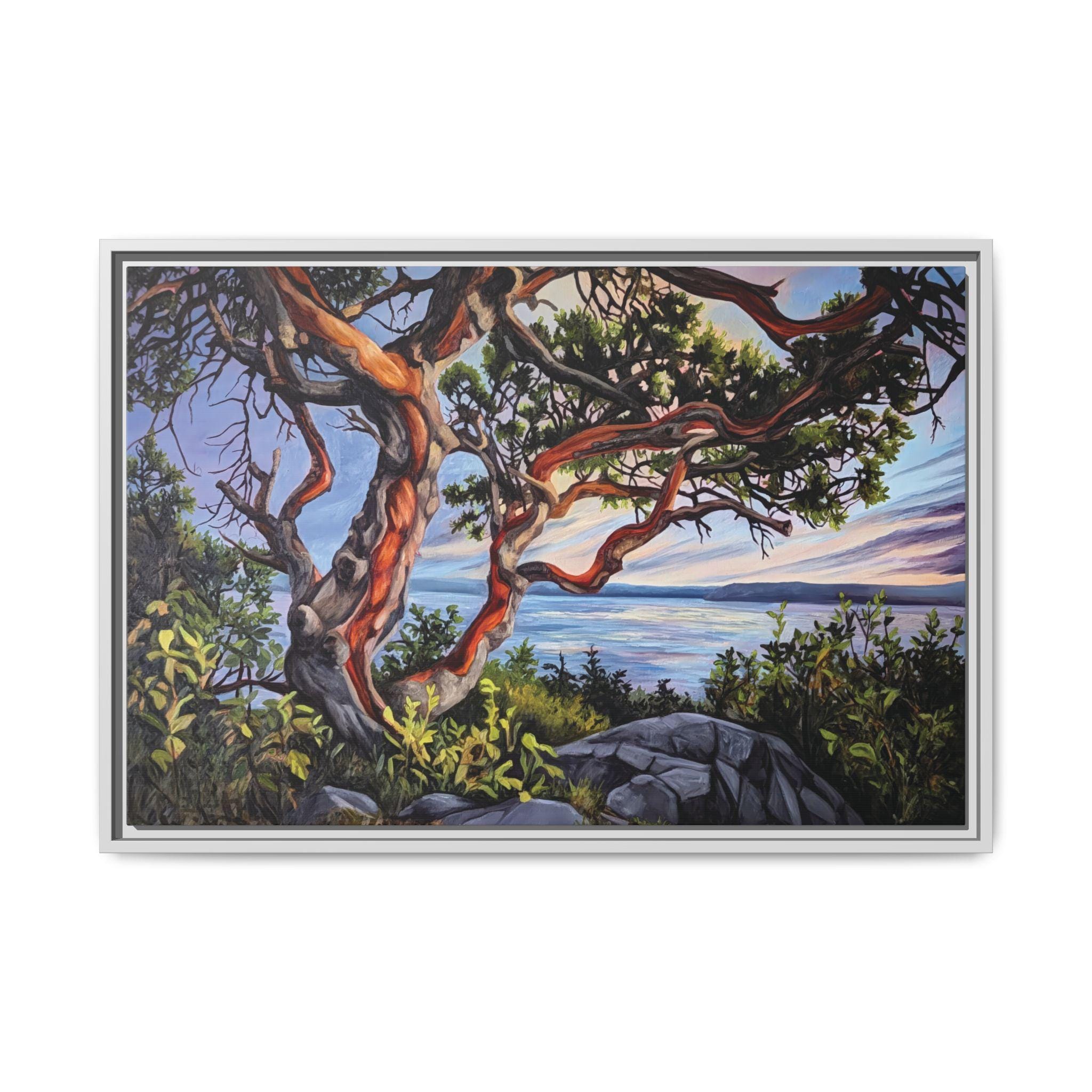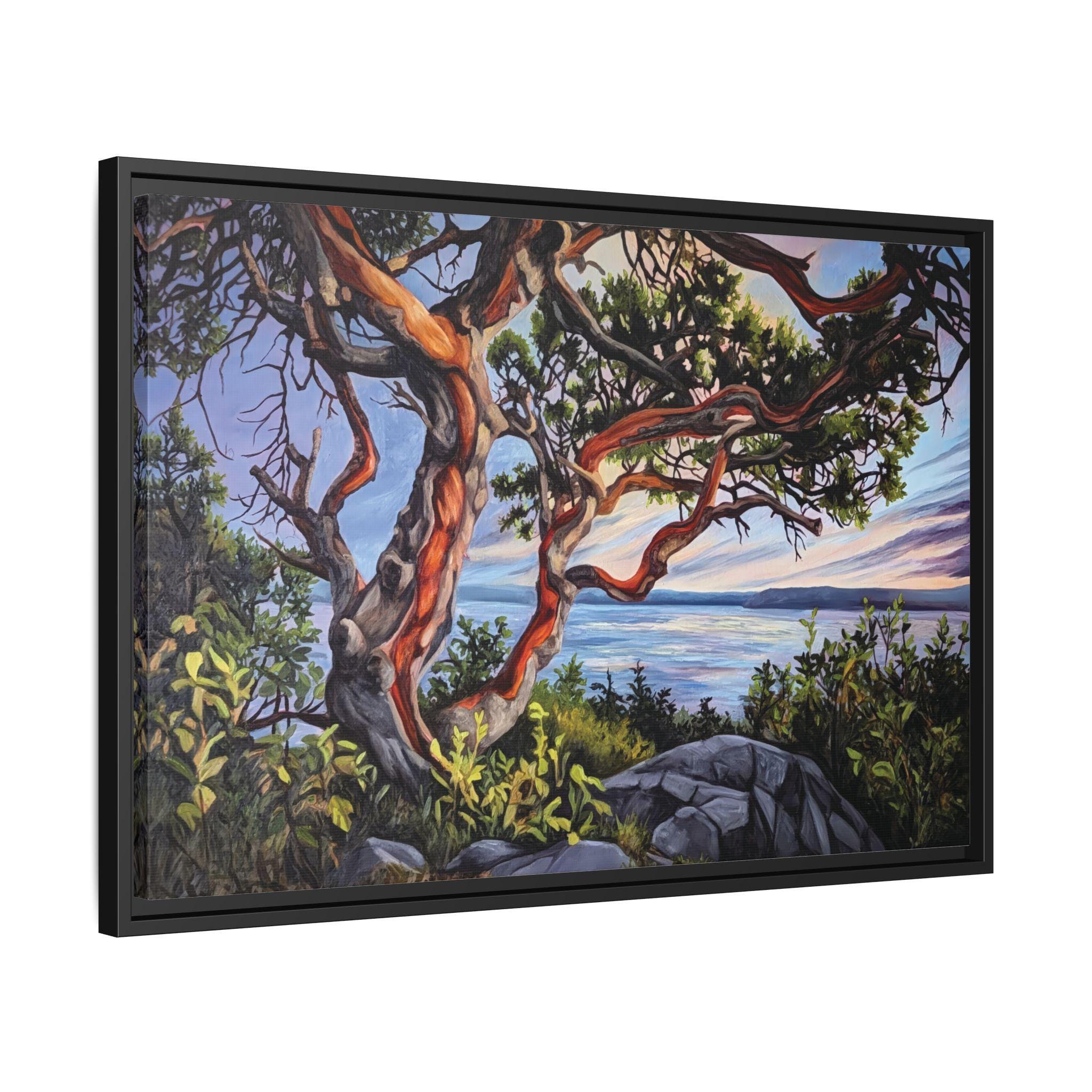 Warm, salty air and the hush of a Pacific sunset — this framed matte canvas brings Andrea Fryett’s oil painting of an arbutus tree and the BC coastline into your living space. The textured matte surface keeps glare low and emphasizes brushstrokes, while the multi-color framing option lets the piece sit naturally among coastal woods and soft neutrals. Hang it over a reading nook, above a mantel, or in an entryway where it can be a quiet reminder of shoreline walks and golden-hour light. The scene invites slow breaths and lingering moments, fitting seamlessly into a home that values handmade art, travel memories, and the patient rhythm of the coast.