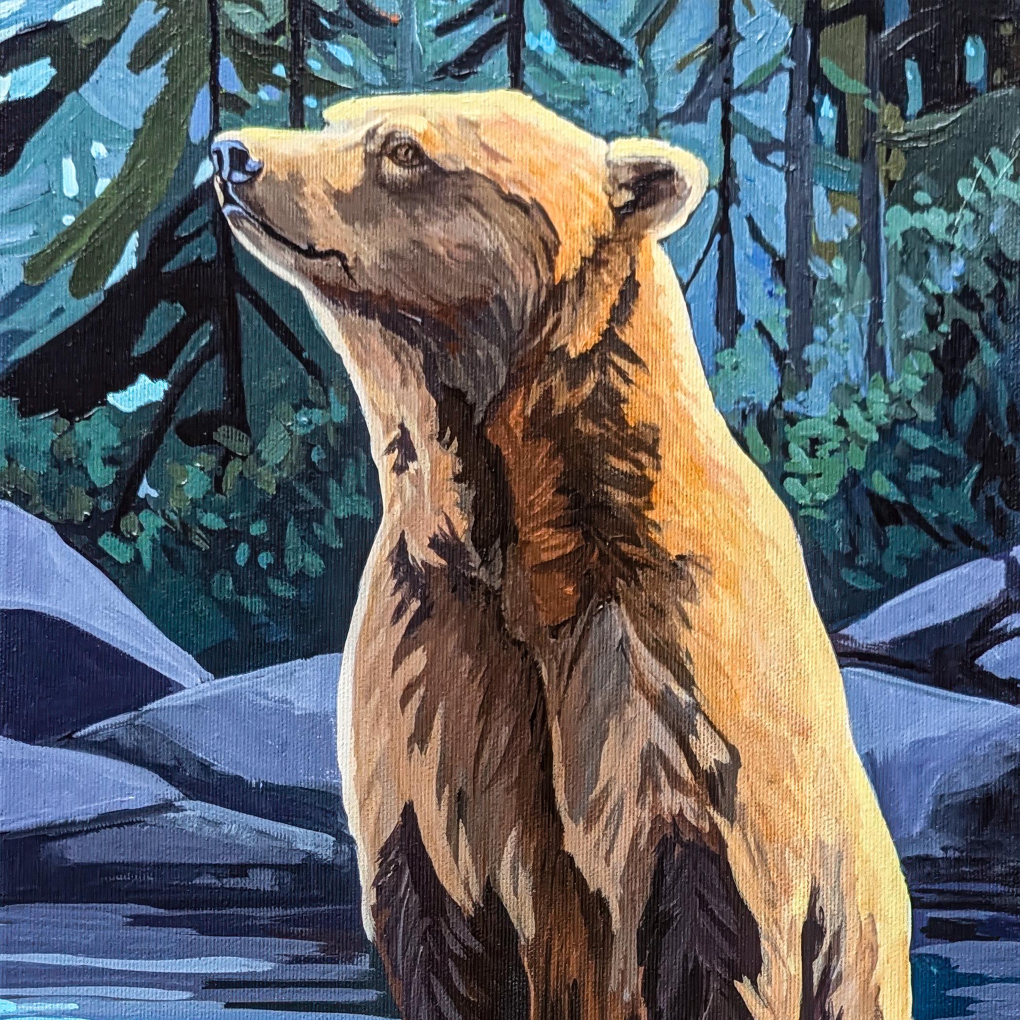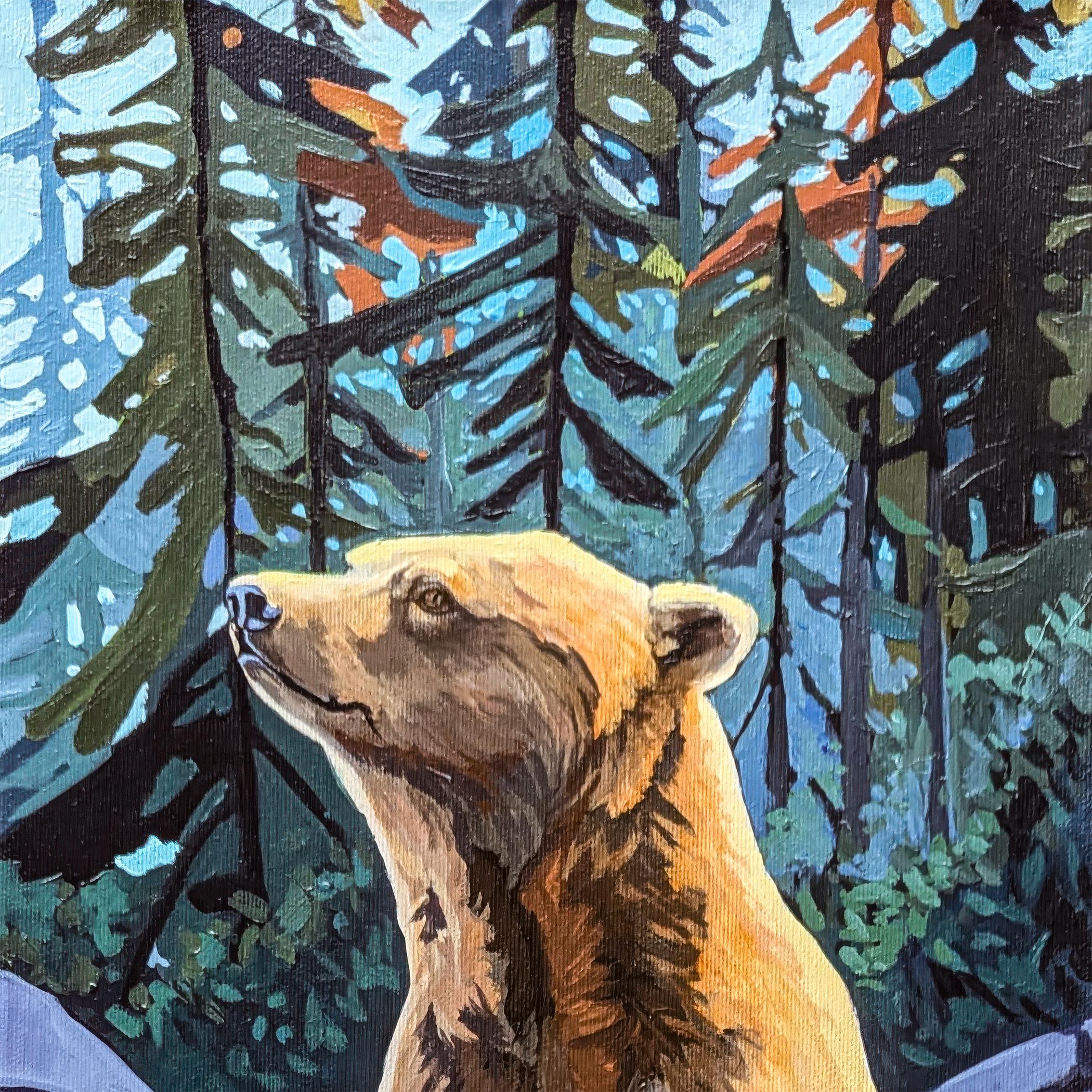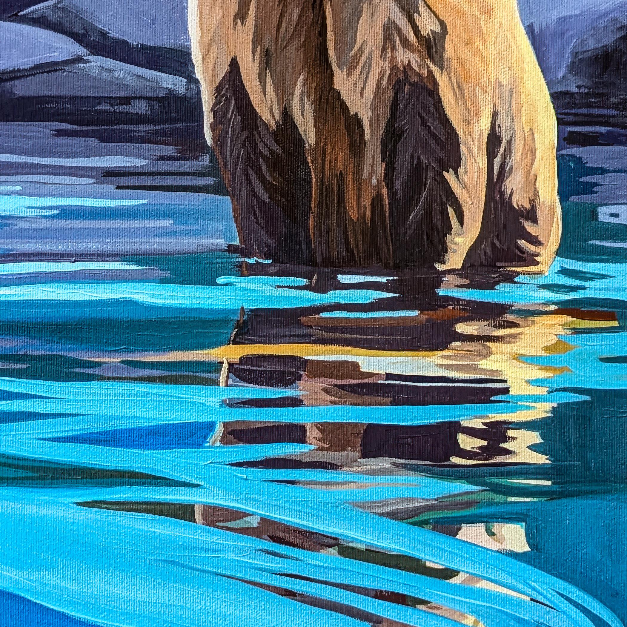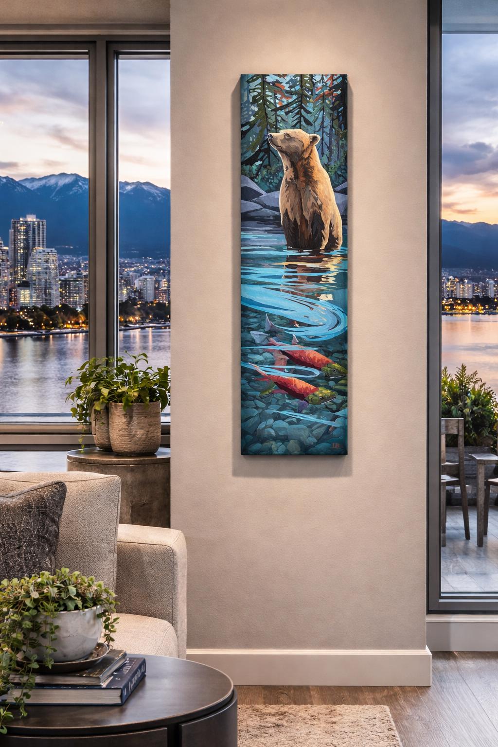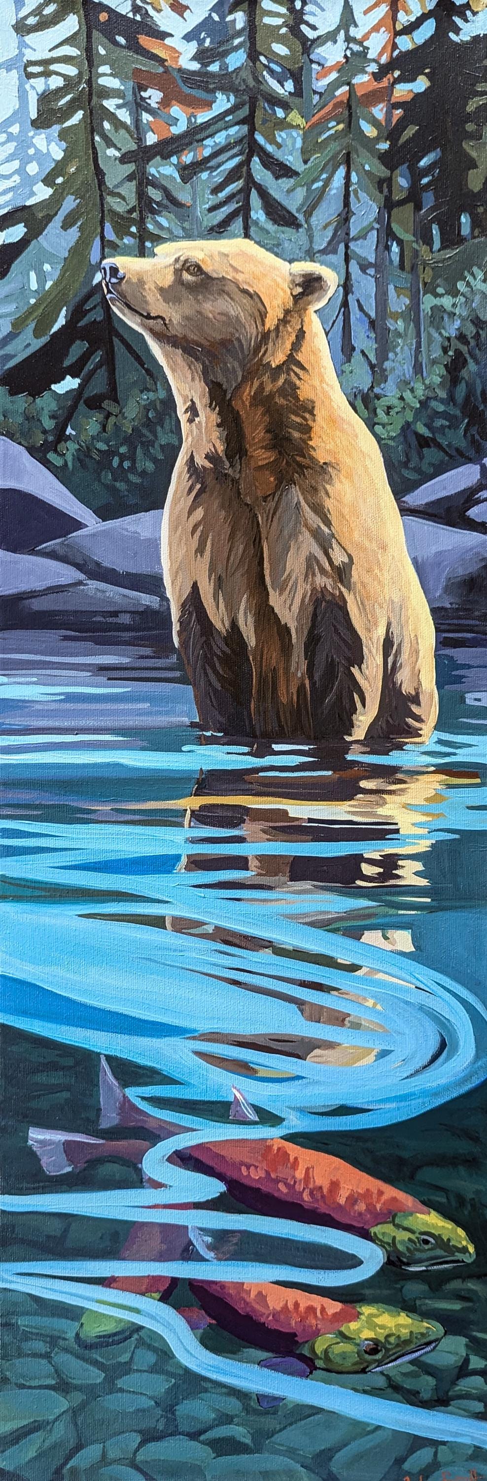 Original wildlife painting featuring a bear and salmon in a Pacific Northwest river setting. A symbolic nature artwork exploring tension, instinct, and the balance between control and surrender. Ideal for collectors of wildlife art, nature-inspired interiors, and contemporary landscape painting.