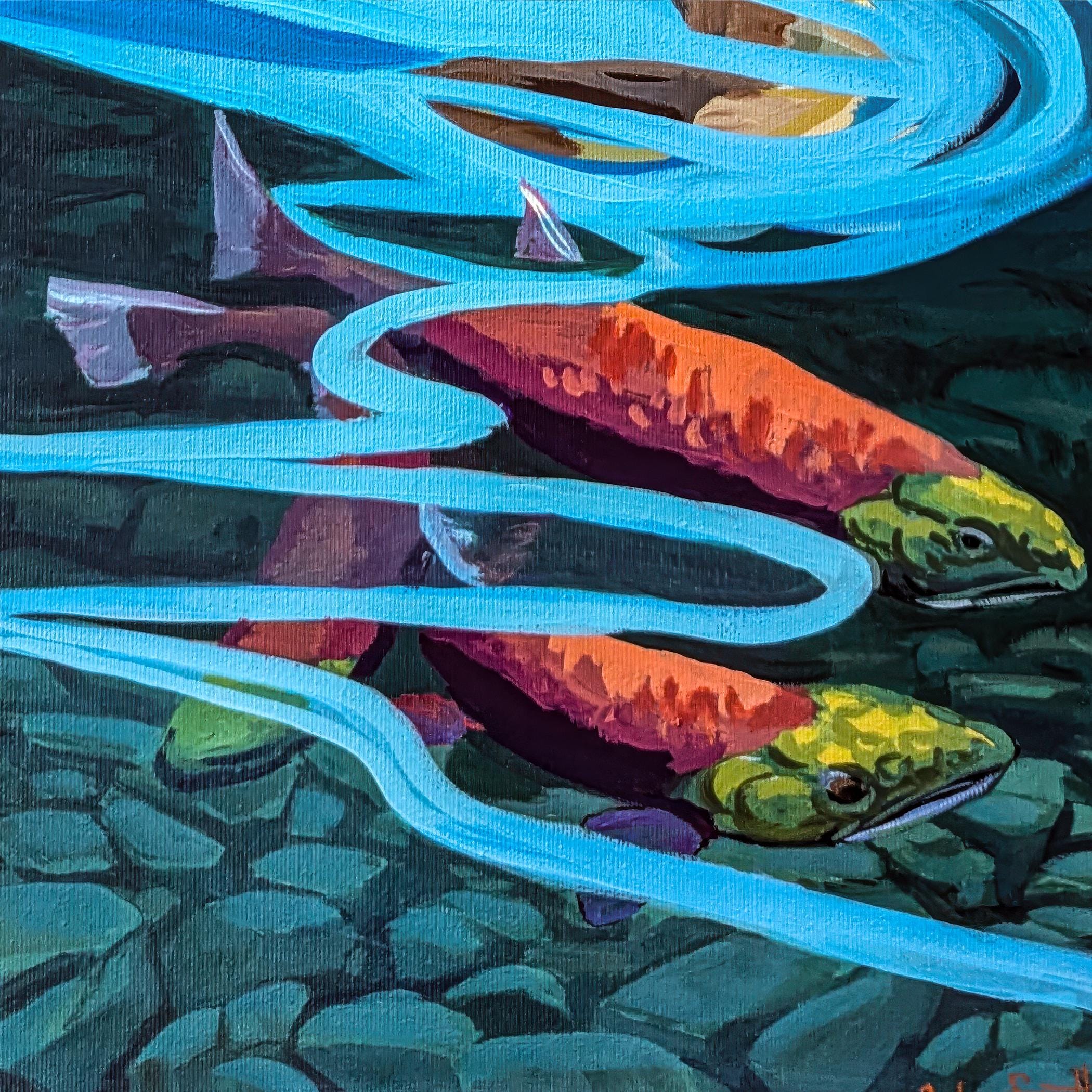 Painted in layered acrylic, this work emphasizes bold shapes, shifting light, and the movement of water, connecting above and below into a single, continuous experience.